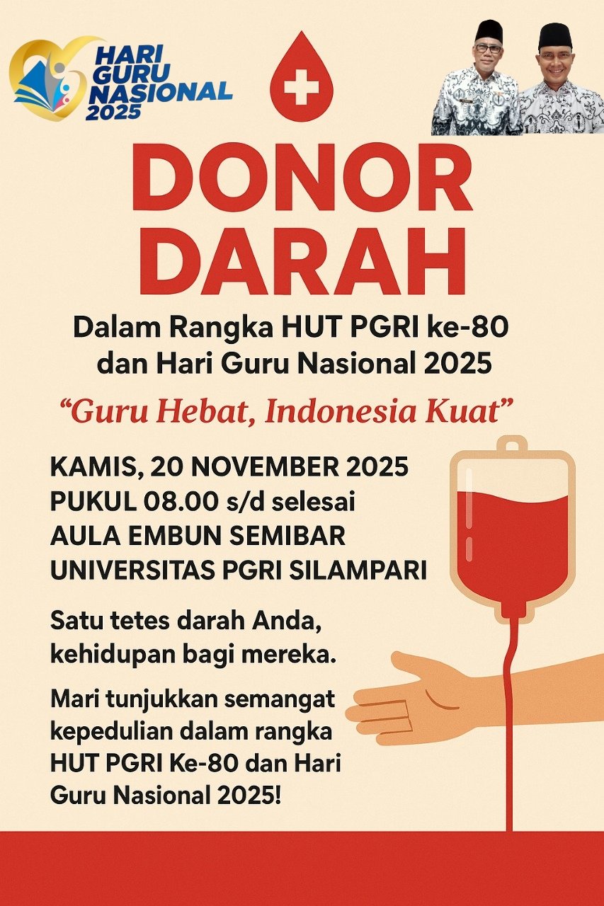 LUBUKLINGGAU,SUARARURU.ID  — Dalam semangat memperingati Hari Ulang Tahun ke-80 Persatuan Guru Republik Indonesia (PGRI) dan Hari Guru Nasional tahun 2025, PGRI Kota Lubuklinggau bersama Universitas PGRI Silampari (UNPARI) menggelar kegiatan sosial berupa aksi donor darah yang akan dilaksanakan pada Kamis, 20 November 2025, bertempat di Aula Embun Semimbar UNPARI, Kelurahan Air Kuti, Kecamatan Lubuklinggau Timur I. Kegiatan dijadwalkan berlangsung mulai pukul 08.00 WIB hingga selesai.