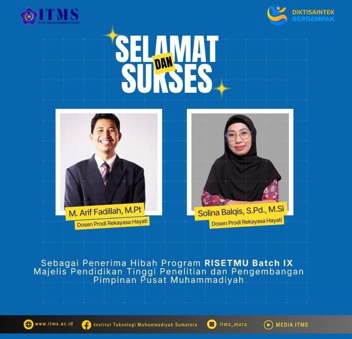 Solina Balqis, S.Pd., M.Si., dan Muhammad Arif Fadillah, M.Pt., yang juga tampak dalam poster ucapan selamat dari institusi, menyatakan rasa syukur dan terima kasih atas dukungan dari ITMS. Mereka berkomitmen untuk melaksanakan penelitian sesuai target dan menghasilkan luaran yang bermanfaat. Capaian ini memperkuat posisi Program Studi Rekayasa Hayati ITMS sebagai pusat keunggulan dalam pengembangan ilmu dan teknologi berbasis hayati, serta menegaskan peran aktif ITMS dalam mendukung visi Muhammadiyah untuk memajukan pendidikan tinggi, penelitian, dan pengembangan.