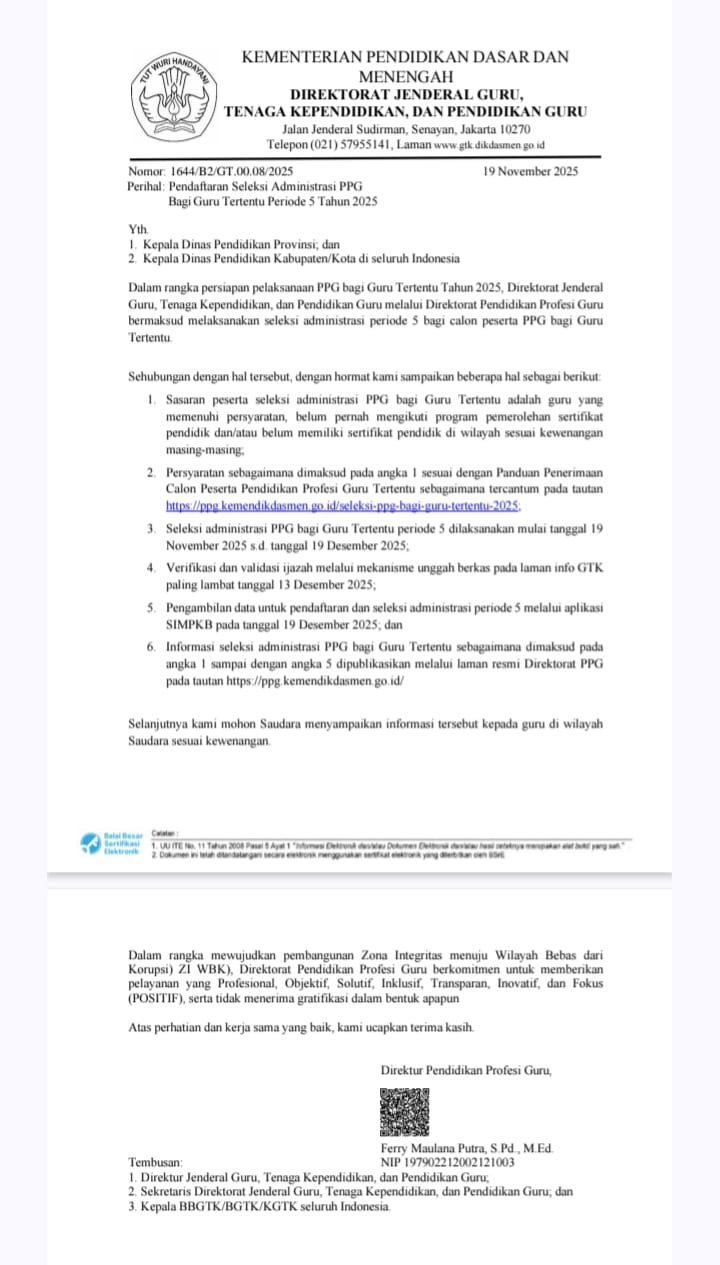 Batas Akhir Verifikasi dan Validasi Ijazah (Unggah Berkas di Info GTK): 13 Desember 2025