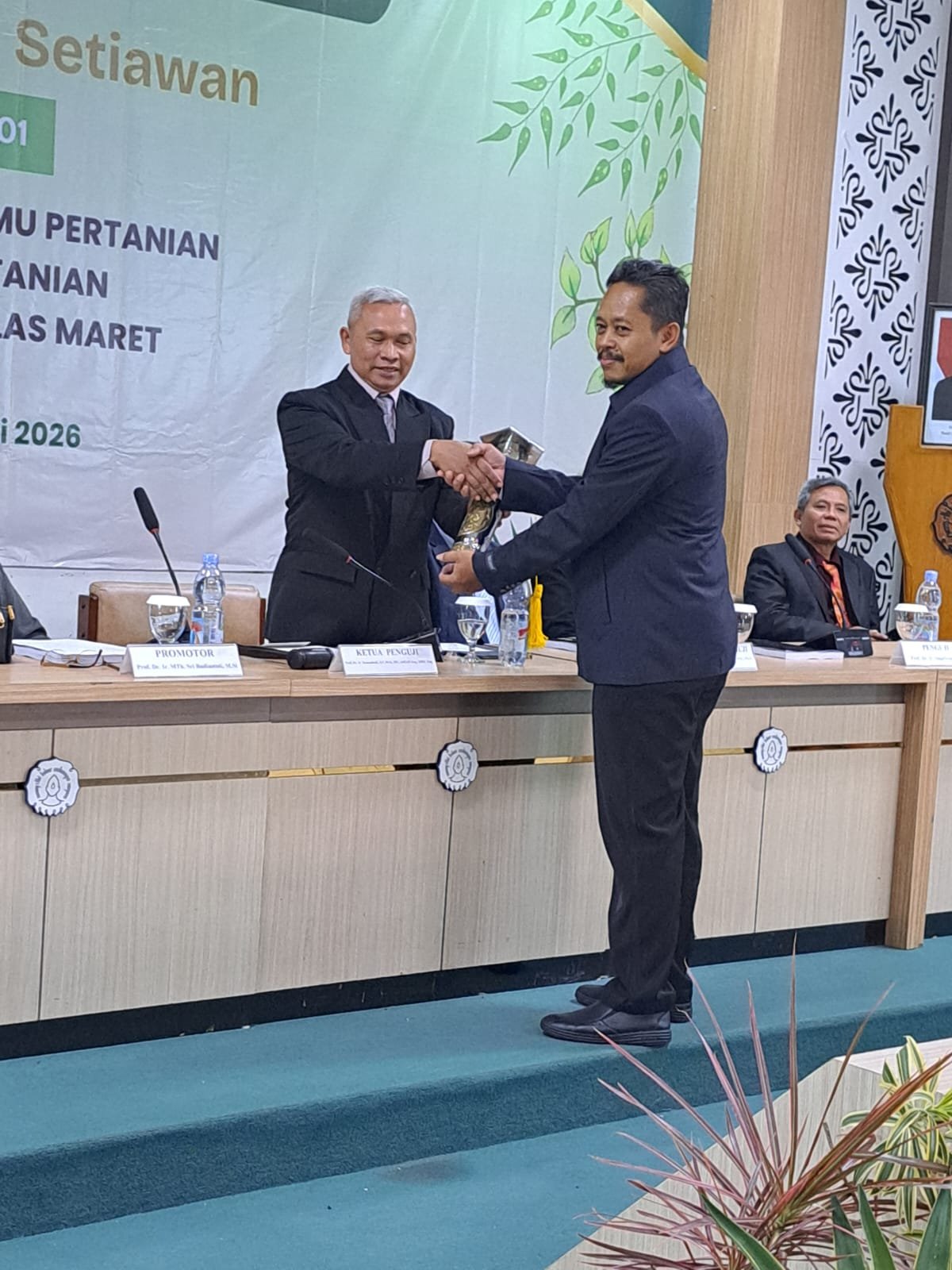 Pada sidang terbuka yang dipimpin oleh Dekan Fakultas Pertanian Universitas Sebelas Maret, Prof. Dr.Ir. Saman Hudi, SP.,M.Si.,IPU.,ASEAN Eng., APEC Eng, dengan Sekretaris Dewan penguji : Prof. Dr. Ir. Danar Prasepttiangga, S.TP., M.Sc., Ph.D, Penguji Internal Prof. Dr. Ir. Supriyono,MS, Penguji Eksternal Dr. Ir. Gatot Supangat Samidjo, MP.IPU. ASEAN Eng dari UMY, beserta anggota penguji sekaligus sebagai tim promotor Prof. Dr. Ir. Maria Theresia Sri Budiastuti, M.Si, Prof. Dr. Ir. Edi Purwanto, M.Sc, dan Prof. Dr. Ir Supriyadi, MS.